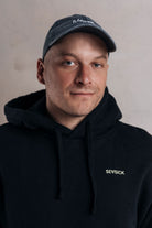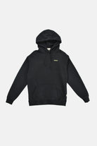 Unisex surf hoodie made from a blend of organic and recycled cotton in black. Features a small chest embroidery and a large back screen print inspired by ocean life. Boxy silhouette with slightly dropped shoulders and a brushed interior for softness and warmth.